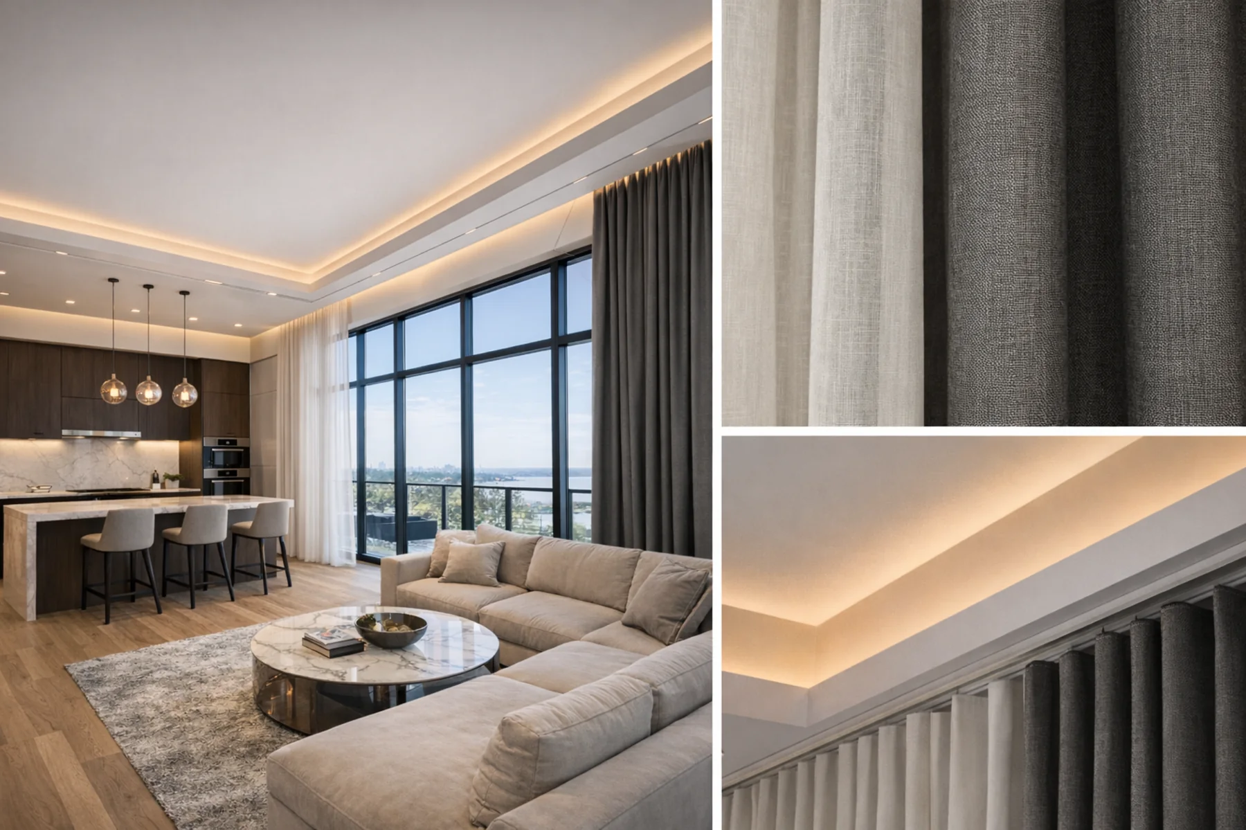 Полный цикл: замер, подбор ткани, пошив, установка карнизов и финальная навеска. Стартуем с телефона, без длинных согласований и потери времени.